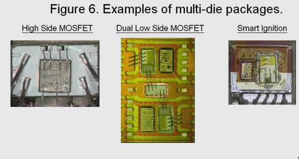 圖6所示為目前車載系統(tǒng)中采用多芯片封裝的幾個實例。這些智能化器件可以提供更高的系統(tǒng)性能監(jiān)控能力,通過集成保護(hù)功能提高功率系統(tǒng)的可靠性。如過流、過壓和過熱保護(hù)等功能都是這類產(chǎn)品的標(biāo)配。當(dāng)器件感測到有可能發(fā)生上述異常狀況時,能夠把功率MOSFET置于自我保護(hù)整個系統(tǒng)的環(huán)境中。此外,這些器件還集成有附加診斷功能,用以監(jiān)控負(fù)載開路或短路,有助于指導(dǎo)汽車機(jī)械裝置隔離和糾正車輛中出現(xiàn)的問題。