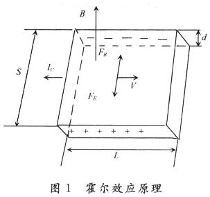 如圖1所示,一個(gè)N型半導(dǎo)體薄片,長度為L,寬度為S,厚度為d,在垂直于該半導(dǎo)體薄片平面的方向上,施加磁感應(yīng)強(qiáng)度為B的磁場,若在長度方向通以電流Ic則運(yùn)動(dòng)電荷受到洛倫茲力的作用,正負(fù)電荷將分別沿垂直于磁場和電流的方向向?qū)w兩端移動(dòng),并聚集在導(dǎo)體兩端形成一個(gè)穩(wěn)定的電動(dòng)勢UH,這就是霍爾電動(dòng)勢(或稱之為霍爾電壓),這種現(xiàn)象稱為霍爾效應(yīng)?;魻栯妷旱拇笮H=RIB/d=KHICB,其中R為霍爾常數(shù);KH為霍爾元件的乘積靈敏度。