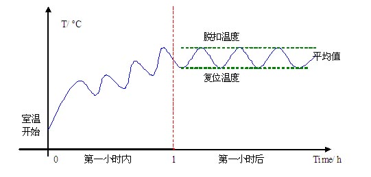 以單相馬達(dá)與自動(dòng)復(fù)位熱保護(hù)器組合為例說(shuō)明,其他情況請(qǐng)查閱相關(guān)標(biāo)準(zhǔn)。測(cè)試在室溫環(huán)境進(jìn)行,堵轉(zhuǎn)72小時(shí),其間熱保護(hù)器必須因繞組溫度升高斷開電路又自動(dòng)復(fù)位,儀器連續(xù)記錄繞組溫度,圖-1的示意圖由經(jīng)驗(yàn)所得。整個(gè)過(guò)程到結(jié)束,必須符合以下結(jié)果: