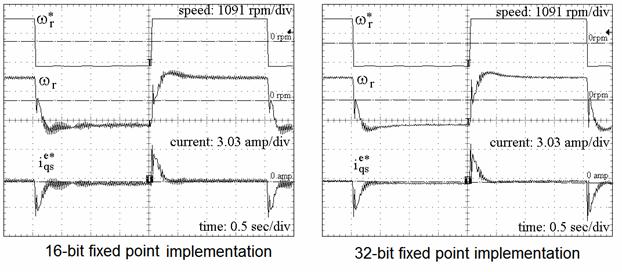 比例積分控制器的積分項總是采用 32 位字長甚至是 16 位定點版本,根據(jù)以往的經驗,采用 16 位積分累加的結果明顯地差的多。采用類似仿真的策略將 ±0.5 pu 的步長應用于系統(tǒng)速度參考。d 軸及 q 軸電流和估測速度作為速度命令的步長,這些也證實了仿真結果。在瞬態(tài)及穩(wěn)態(tài)狀態(tài)下,仿真結果的響應相關性很強。不良振蕩瞬態(tài)及因采用 16 位實施造成的瞬態(tài)時間增加等情況下的量化效應是可以驗證的。