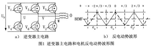 實現(xiàn)無刷直流電機電子換相及PWM控制的逆變器主電路如圖1a所示。采用兩兩通電方式,即每一個瞬間有兩個功率管導(dǎo)通,每隔60°電角度換相1次,每一功率管導(dǎo)通120°電角度。功率管的導(dǎo)通順序是:V6V1→V1V2→V2V3→V3V4→V4V5→V5V6。