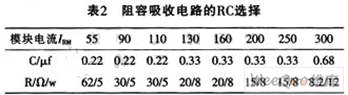 模塊過壓保護(hù)一般也可采用阻容吸收法。對(duì)于持續(xù)時(shí)間較短,能量不大的過電壓,一般可在模塊兩端并聯(lián)阻容吸收電路,用吸收電容把過電壓的電磁能量變成靜電能量存貯起來。而用吸收電阻不但可以防止電路振蕩,還可限制晶閘管導(dǎo)通時(shí)電容放電所產(chǎn)生的開通損耗和di/dt值。并聯(lián)在晶閘管開關(guān)模塊的RC值可參考表2。