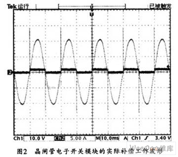 在無功補(bǔ)償實(shí)際應(yīng)用中,可將晶閘管電子開關(guān)模塊用在TSC低壓無功補(bǔ)償以替代接觸器,這樣,就可以在開關(guān)電壓過零時(shí)投入補(bǔ)償電容量,從而避免了沖擊電流的產(chǎn)生和瞬間電網(wǎng)電壓的波動(dòng)。圖2所示是其工作波形圖。