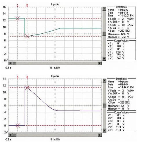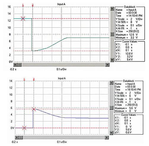 由于RM、RB、RL均非常低,啟動(dòng)電流非常大。例如用12V、45Ah的蓄電池啟動(dòng)安裝1.9升柴油機(jī)的汽車,蓄電池的電壓在啟動(dòng)瞬間由12.6V降到約3.6V!啟動(dòng)過程的蓄電池電壓波形如圖1;啟動(dòng)瞬時(shí)的電流達(dá)550A,約為蓄電池的12C的放電率!啟動(dòng)過程的蓄電池電流波形如圖2,(電流傳感器的電流/電壓變換比率:100A/V)。盡管車用蓄電池是啟動(dòng)專用蓄電池,可以高倍率放電,但在圖1中可以看出,10倍以上的高倍率放電時(shí)的蓄電池性能變得很差,而且,如此高倍率放電對(duì)蓄電池的損傷也是非常明顯的。啟動(dòng)過程的電壓劇烈變化也是極強(qiáng)的電磁干擾,可以造成電氣設(shè)備的“掉電”,迫使電氣設(shè)備在發(fā)電機(jī)啟動(dòng)過程結(jié)束后重新上電,計(jì)算機(jī)在這個(gè)過程中非常容易死機(jī)。因此,無論從改善汽車電氣設(shè)備的電磁環(huán)境還是改善汽車的啟動(dòng)性能和蓄電池的性能、延長(zhǎng)使用壽命來考慮,改善汽車電源在啟動(dòng)過程的性能是必要的。