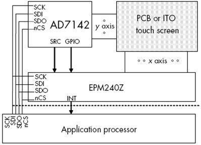 AD7142 CDC可以測量14個(gè)傳感器相對于一條SRC走線的電容。增加MAX IIZ CPLD后,可在串行接口的控制下,獲得AD7142 CDC的SRC方波信號,并選擇驅(qū)動(dòng)觸摸屏的某一條垂直x走線,從而支持多條SRC走線。AD7142 CDC可以進(jìn)行相對于垂直走線軸或者本地的電容測量。MAX IIZ中大量的I/O (5x5mm封裝支持54個(gè)I/O,7x7mm封裝支持116個(gè)I/O)結(jié)合AD7142的高分辨率電容數(shù)字測量能力,使這一解決方案能夠適用于面積較大的觸摸屏和面板。