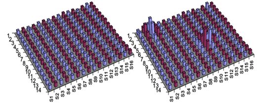 圖4為AD7142 CDC和MAX IIZ CPLD相結(jié)合后的2D電容測量結(jié)果,顯示了16條走線,即,對x軸進(jìn)行了16次劃分。左側(cè)是基線電容測量,而右側(cè)是兩個(gè)手指觸摸傳感器后的結(jié)果。圖中藍(lán)色和紅色采樣行表示哪一SRC走線被激活。