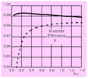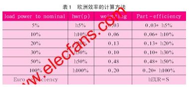對(duì)于傳統(tǒng)電力電子裝置的設(shè)計(jì),我們通常是通過每千瓦多少錢來衡量其性價(jià)比的。但是對(duì)于光伏逆變器的設(shè)計(jì)而言,對(duì)最大功率的追求僅僅是處于第二位的,歐洲效率的最大化才是最重要的。因?yàn)閷?duì)于光伏逆變器而言,不僅最大輸出功率的增加可以轉(zhuǎn)化為經(jīng)濟(jì)效益,歐洲效率的提高同樣可以,而且更加明顯。歐洲效率的定義不同于我們通常所說的平均效率或者最高效率。它充分考慮了太陽光強(qiáng)度的變化,更加準(zhǔn)確地描述了光伏逆變器的性能。歐洲效率是由不同負(fù)載情況下的效率按照不同比重累加得到的,其中半載的效率占其最大組成部分(見圖1)。