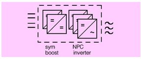 這里標(biāo)準(zhǔn)的應(yīng)用是使用三相全橋電路??紤]到直流母線電壓會(huì)達(dá)到1000v,那開關(guān)器件就必須使用1200v的。而我們知道,1200v功率器件的開關(guān)速度會(huì)比600v器件慢很多,這就會(huì)增加損耗,影響效率。對(duì)于這種應(yīng)用,一個(gè)比較好的替代方案是使用中心點(diǎn)箝位(npc=neutral point clamped)的拓?fù)浣Y(jié)構(gòu)(見圖8)。這樣就可以使用600v的器件取代1200v的器件。