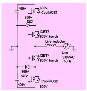 這種拓?fù)渲皇褂昧藘蓚€(gè)600v的sic二極管(d4,d6)。d3和d5采用快速si二極管,d7和d8采用小型si二極管,用來防止sic二極管過壓損壞。