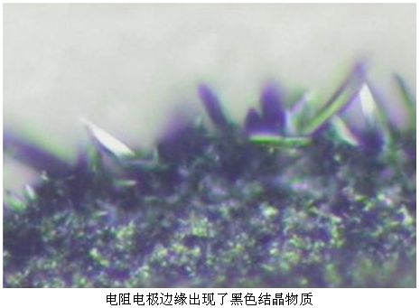 有一批現(xiàn)場(chǎng)儀表在某化工廠使用一年后,儀表紛紛出現(xiàn)故障。經(jīng)分析發(fā)現(xiàn)儀表中使用的厚膜貼片電阻阻值變大,甚至變成開路了。把失效的電阻放到顯微鏡下觀察,可以發(fā)現(xiàn)電阻電極邊緣出現(xiàn)了黑色結(jié)晶物質(zhì),進(jìn)一步分析成分發(fā)現(xiàn),黑色物質(zhì)是硫化銀晶體。原來(lái)電阻被來(lái)自空氣中的硫給腐蝕了!
