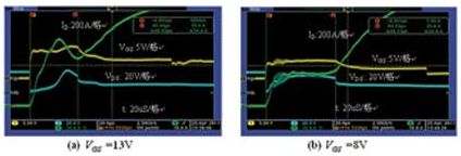 在不同的柵級電壓下測量短路電流,測試波形如圖2所示,采用的功率MOSFET為AOT266。圖2(a):VGS電壓為13V,短路電流達1000A,MOSFET在經過47μs后電流失控而損壞;圖2(b):VGS電壓為8V,短路電流僅為500A,MOSFET在經過68μs后電流失控而損壞。電流測試使用了20:1的電流互感器,因此電流為200A/格。