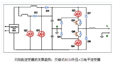 有很多方法能夠提高升壓逆變器的效率。由于升壓逆變器可在連續(xù)傳導(dǎo)模式或邊界傳導(dǎo)模式(CCM 或 BCM)下工作,這就衍生出不同的優(yōu)化方案。在CCM模式中,損耗的一大主因是升壓二極管的反向恢復(fù)電流;在這種情況下,一般使用碳化硅二極管或飛兆半導(dǎo)體的Stealth 二極管來解決。太陽能逆變器更常采用的是BCM模式,而盡管對(duì)這類功率級(jí)通常建議選擇CCM模式,但采用BCM模式的原因在于BCM模式中二極管的正向電 壓要低得多。而且,BCM模式也具有高得多的EMI濾波器和升壓電感紋波電流。這時(shí),良好的高頻電感設(shè)計(jì)是一解決方案。