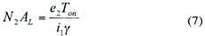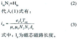 式中:e2為次級感應(yīng)電壓,Ton為導(dǎo)通時間,N2為次級線圈匝數(shù),Ae為磁芯有效截面積,△B為工作磁感應(yīng)強(qiáng)度,單位為特斯拉(T)。