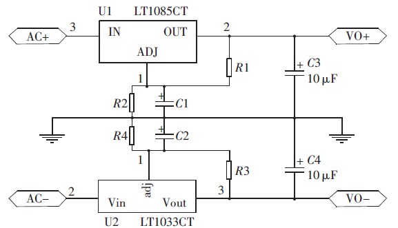 LT1083/LT1033 系列正負(fù)可調(diào)穩(wěn)壓器的效率大大高于現(xiàn)有器件,可以提供7.5 A、5 A 和3 A 輸出電流,并能在低至1 V 的壓差條件下運(yùn)行,壓降在最大電流條件下保證在1.5 V 以內(nèi)。負(fù)載電流減小時(shí)允許壓差同時(shí)減小,可在多種電流水平條件下通過(guò)片內(nèi)修整電路,提供所保證的最小壓差,并能夠使輸出電壓準(zhǔn)確度調(diào)節(jié)至1%.其電壓調(diào)整率為0.015%,負(fù)載調(diào)整率為0.01%,對(duì)電流限值也進(jìn)行了修整,最大限度地減小了過(guò)載條件下穩(wěn)壓器和電源電路上承受的應(yīng)力,具有熱功耗限制保護(hù)[10].LT1083/LT1033 系列器件的引腳與老式三端穩(wěn)壓器兼容,與大多數(shù)穩(wěn)壓器設(shè)計(jì)中的10 μF 輸出電容器以及PNP 穩(wěn)壓器多達(dá)10%的輸出電流作為靜態(tài)電流消耗不同,LT1083/LT1033 系列的靜態(tài)電流流入負(fù)載, 大大降低了電源功耗。此芯片電壓調(diào)整率小、負(fù)載調(diào)整率小的特點(diǎn)能夠保證輸出電壓穩(wěn)定度高。正負(fù)線性穩(wěn)壓模塊電路如圖3 所示,其中R1=R3,R2=R4.電路中的電阻參數(shù)可根據(jù)輸出可調(diào)電壓公式確定: