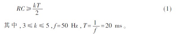 整流濾波電路主要由整流橋堆和大容量濾波電容組成, 如圖2 所示。整流橋堆具有體積小巧、輸出電流大、安裝方便等優(yōu)勢(shì), 并能代替由4 只二極管組成的傳統(tǒng)橋式整流電路。濾波電路采用大容量電解電容濾波,增加了輸出電壓的穩(wěn)定性。根據(jù)式(1) 可求出所需濾波電容容量。