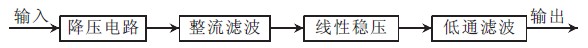 本設(shè)計(jì)由降壓模塊、整流濾波模塊、線性穩(wěn)壓模塊和低通濾波模塊組成, 如圖1 所示。變壓器將220 V/50 Hz 交流電分別降壓到±16 V、±6 V、+6 V, 通過(guò)整流橋堆整流以及大容量電容濾波后, 進(jìn)入正( 負(fù)) 線性穩(wěn)壓模塊, 再經(jīng)過(guò)低通濾波模塊濾除直流以外的干擾信號(hào), 分別輸出±15 V、±5 V、+5 V 的穩(wěn)定電壓。