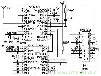 主控制器電路原理如圖3所示。主控制器模塊采用穩(wěn)定、可靠的微控制器C8051F531A,其內(nèi)置振蕩電路和增強(qiáng)型的SPI接口,外擴(kuò)SPI無(wú)線接收芯片MC33594和操作簡(jiǎn)單、方便的并行液晶模塊。