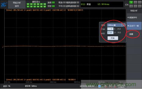 第三步,點(diǎn)擊圖 3菜單中“測(cè)量”區(qū)域,使界面出現(xiàn)“測(cè)量”字樣,此時(shí)儀器界面中的波形會(huì)停止刷新。然后通過(guò)“自動(dòng)下一幀”菜單,選擇要查看的波形幀數(shù),可以選擇從第一幀開始,到最后一幀介紹,然后設(shè)定每一幀的回放速度(從人眼的反應(yīng)考慮,建議選擇200ms/幀以上),點(diǎn)擊開始之后,界面中的波形會(huì)進(jìn)行回放,當(dāng)看到想要看的波形后按停止按鍵,然后通過(guò)“數(shù)據(jù)序號(hào)”來(lái)調(diào)整波形,確??吹阶约合胍牟ㄐ?,如圖 4所示;