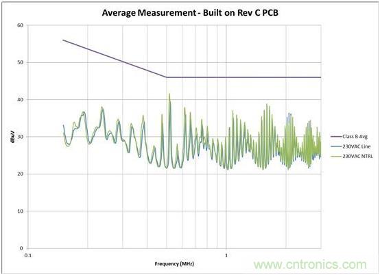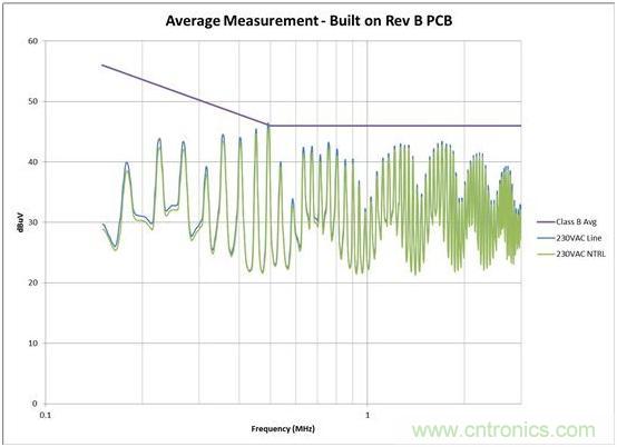 圖3.從電路板布局進(jìn)行 EMI 掃描,其中 AC 輸入與開關(guān)電路之間距離較大