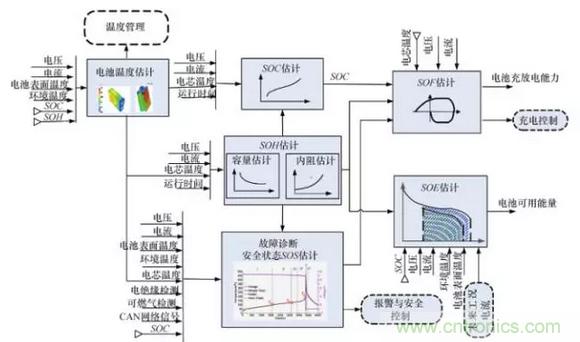 (2)電池狀態(tài)估計(jì)。包括荷電狀態(tài)(SOC)或放電深度(DOD)、健康狀態(tài)(SOH)、功能狀態(tài)(SOF)、能量狀態(tài)(SOE)、故障及安全狀態(tài)(SOS)等;