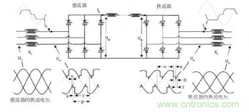 由于晶閘管只能接通,不能斷開(kāi),因此交流電壓會(huì)使晶閘管發(fā)生反向偏置并停止傳導(dǎo)。因此,LCC中的晶閘管的偏置取決于電網(wǎng)AC側(cè)用于換流的功率。在晶閘管正向偏置后導(dǎo)通時(shí)的延時(shí)決定了相位角延遲(觸發(fā)角)。晶閘管的相位角延遲實(shí)現(xiàn)了交流波的相位角控制。