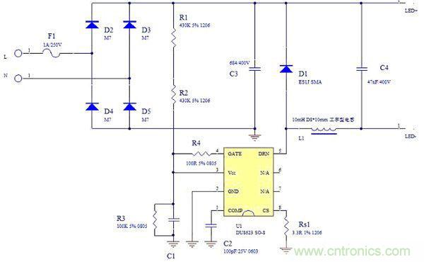全閉環(huán)控制,檢測輸出電流,來發(fā)出PWM信號,是真正的恒流電源驅動控制技術。實驗表明,相對于其他非閉環(huán)的方案,這種獨有的閉環(huán)恒流控制技術使輸出電流精度有了質的飛躍,使整機電源在全電壓、全負載、電感變化范圍內的電流精度達到行業(yè)內目前最高的±0.9%.基于此閉環(huán)控制技術,DU8623集成1A高壓MOSFET,并且根據(jù)某些應用要求省略了電解電容,這就提供了一種高恒流精度,低成本、壽命優(yōu)化的產品。