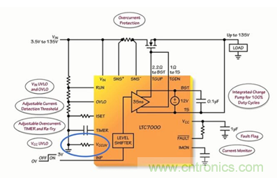 在經(jīng)過該冷卻周期之后,內(nèi)部電路將自動(dòng)嘗試重新接通外部 MOSFET,該重試占空比約為 0.06%。所以應(yīng)該選擇合適的過流跳變點(diǎn)和 TIMER 電容器,以通過把 MOSFET 保持在 MOSFET 產(chǎn)品手冊中規(guī)定的安全工作區(qū)內(nèi)以保護(hù)外部 MOSFET。