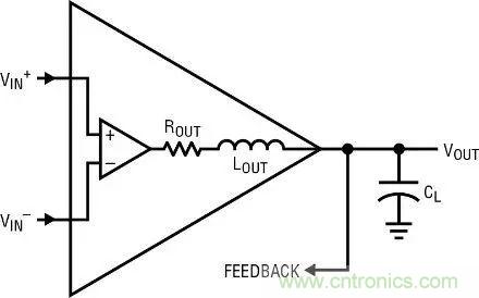 此外,任何放大器都有 20nH 至 70nH 的電生電感,尤其是雙極型器件。器件的有限 Ft 將輸出晶體管的寄生基極電阻變成電感。危害是,Lout 與 CL 可能相互作用,形成一個(gè)串聯(lián)諧振電路,那么同樣的問(wèn)題又來(lái)了,如果環(huán)路中沒(méi)有更大的相位滯后,串聯(lián)諧振電路的阻抗就可能降至 Rout 無(wú)法驅(qū)動(dòng)的水平,從而可能產(chǎn)生振蕩。例如,設(shè)定 Lout = 60nH 和 CL = 50pF。諧振頻率