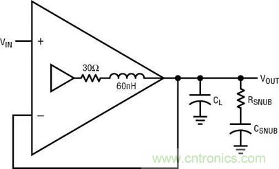 防止負(fù)載電容引起振蕩的最常見(jiàn)方式是,在反饋連接之后,簡(jiǎn)單地給電容串聯(lián)一個(gè)小阻值的電阻器。10Ω 至 50Ω 的阻值將限制容性負(fù)載可能引起的相位滯后,并在速度非常高的時(shí)候,隔離放大器和低容性阻抗。缺點(diǎn)包括隨負(fù)載電阻特性而變化的 DC 和低頻誤差、容性負(fù)載頻率響應(yīng)受到限制、以及如果負(fù)載電容在電壓變化時(shí)不恒定所導(dǎo)致的信號(hào)失真。