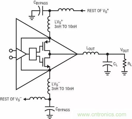 最后一個(gè)需要考慮的振蕩源是電源旁路。圖 10 顯示了輸出電路的一部分。LVS+ 和 LVS– 是不可避免的封裝、IC 接合線(xiàn)、旁路電容器的物理長(zhǎng)度 (像任何導(dǎo)體一樣也是電感性的) 以及電路板走線(xiàn)的串聯(lián)電感。還包括將局部旁路組件連接到電源總線(xiàn)其余部分 (如果不是電源平面) 的外部電感。盡管 3nH 至 10nH 看起來(lái)似乎不大,但是在 200MHz 時(shí),就是 3.8 至 j12Ω。如果輸出晶體管傳導(dǎo)大的高頻輸出電流,那么在電源電感兩端會(huì)存在壓降。