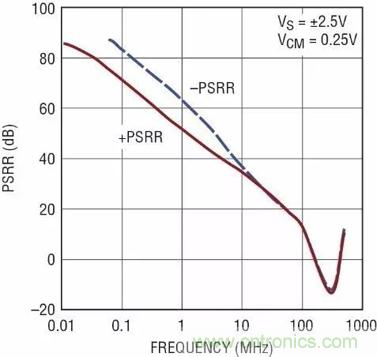 放大器的其余部分需要無(wú)噪聲電源,因?yàn)檫@些部分不能隨著頻率變化抑制電源噪聲。在圖 11 中我們可以看到 LTC6268 隨頻率變化的電源抑制比 (PSRR)。在所有運(yùn)算放大器中,因?yàn)闆](méi)有接地引腳,所以補(bǔ)償電容器都連接到電源,會(huì)將電源噪聲耦合到放大器中,gm 必須抵消這種噪聲。由于補(bǔ)償,PSRR 隨著 1/f 降低,而且過(guò)了 130MHz 后,電源抑制實(shí)際上在變大。在 200MHz 時(shí),因?yàn)?PSRR 的增大,輸出電流可能干擾 LVs 電感器內(nèi)部的電源電壓,通過(guò) PSRR 的放大,干擾變成很強(qiáng)的放大器信號(hào),驅(qū)動(dòng)輸出電流、產(chǎn)生內(nèi)部電源信號(hào)等,導(dǎo)致放大器振蕩。這就是所有放大器的電源都必須用電感很小的走線(xiàn)和組件精心旁路的原因。此外,電源旁路電容器必須比任何負(fù)載電容都大得多。