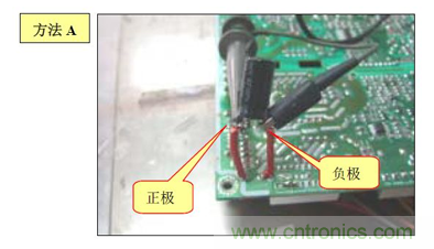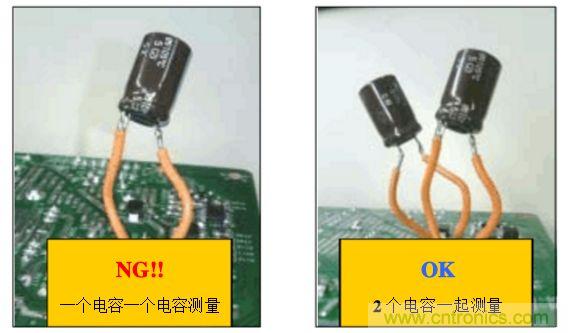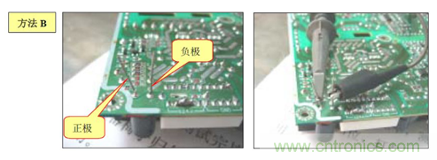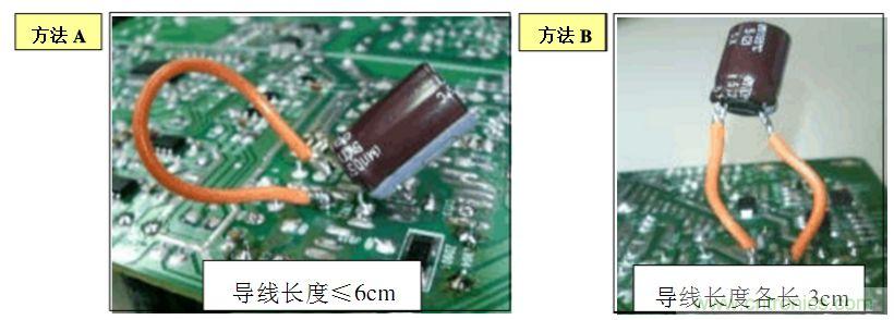 B. 方法(2):在電源板的錫面找出待測電容正負(fù)極對應(yīng)的焊點,焊上兩根導(dǎo)線,然后用電壓探頭夾住引出的導(dǎo)線測試.如下圖: