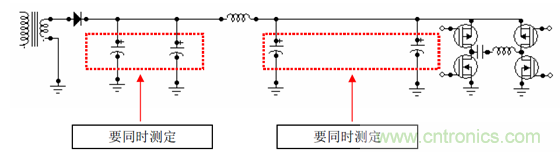 C.平滑COIL 前后連接上2 個以上的電解電容時,請同時連接上導(dǎo)線測量每個電容的紋波電流,如將導(dǎo)線一個一個連接起來測量的話,無法測出正確的電流值。如下圖: