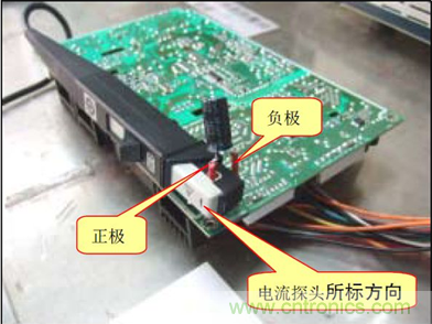 A.將電流探頭夾持待測電解電容正極PIN 腳,并且注意探頭所標(biāo)方向與電容電流方向一致. 如下圖: