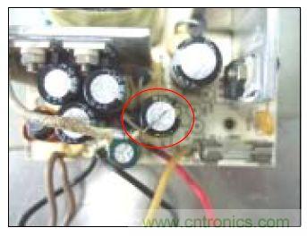 A.當(dāng)電路板上電容所在的位置周圍沒有裝有發(fā)熱器件時,直接將溫度感應(yīng)探測端接于電容頂部鋁殼上, 溫度感應(yīng)探測線另一端連接點溫機(jī),如下圖: