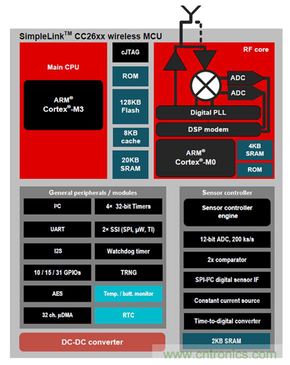 MCU帶集成藍(lán)牙®低功耗無線電:采用TI的SimpleLink超低功耗無線MCU平臺(tái),具有低功耗無線電和MCU組合使傳感器終端節(jié)點(diǎn)的電池使用壽命延長。而且,CC2650設(shè)備是一個(gè)多標(biāo)準(zhǔn)設(shè)備,針對藍(lán)牙、ZigBee®、6LoWPAN和ZigBeeRF4CE遙控器應(yīng)用。在這個(gè)TI設(shè)計(jì)中,藍(lán)牙是可選擇的協(xié)議,但是硬件也可以與其他協(xié)議一起工作。
