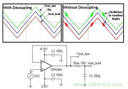 未采用去耦電容的器件無法提供暫態(tài)電流,因此放大器的內(nèi)部節(jié)點會下垂(通常稱為干擾)。無去耦電容的器件其內(nèi)部電源干擾會導致器件工作不連續(xù),原因是內(nèi)部節(jié)點未獲得正確的偏置。