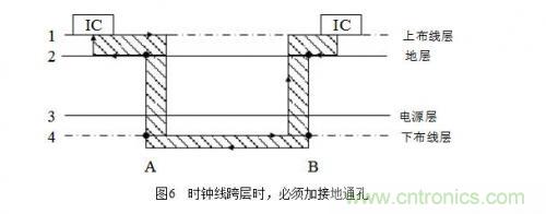 在布線時盡量少穿過孔,因為過孔阻抗和線阻抗不一樣,存在阻抗突變,從而產(chǎn)生駐波使信號變壞,容易形成輻射,尤其是在時鐘需要穿層時,要做技術(shù)處理,時鐘線跨層時的處理如圖6所示。