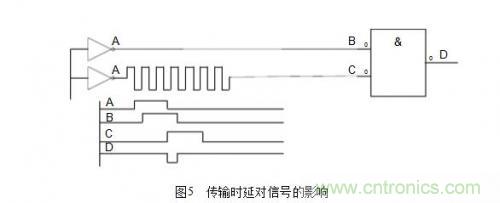 (3)保證信號在PCB上可靠的傳輸,確保信號的完整性。這里面主要的問題一般包括時延、阻抗不匹配、地彈跳、串音等。這不但影響到電子器件的穩(wěn)定工作,還會產(chǎn)生電磁干擾。一般在高速邏輯設(shè)計中最容易碰到時延問題,處理不好會產(chǎn)生不希望的脈沖干擾。傳輸時延對信號的影響如圖5所示。