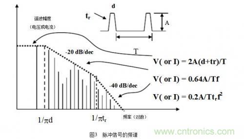 在EMC中,除了基本頻率外,還需考慮諧波因素,通常取十倍頻,但在數(shù)字電路中卻有些不同,比如在時鐘電路和邏輯門電路中,輻射帶寬與數(shù)字信號的上升沿或下降沿有關(guān)系,而不是數(shù)字信號的重復(fù)周期,其關(guān)系為:rtF?/1max?,其中rt是脈沖的上升沿時間。例如,典型時鐘驅(qū)動的邊沿速率是2ns,此時,maxF≈160MHz,再考慮十倍頻,則此時鐘電路可能產(chǎn)生直到1.6GHz的輻射帶寬。所以在選擇器件時要選擇慢速的邏輯器件系列,因為器件對電磁輻射貢獻(xiàn)的大小與工作頻率無直接關(guān)系而只取決于邊沿速率(這和從電路功能設(shè)計上選擇快速器件是矛盾的,在電路設(shè)計時需要折中考慮)。還有從器件的抗擾能力上來說,CMOS器件是最好的,因為它的噪聲容限高。從封裝上來說,BGA是最好的,因為它的引線很短。脈沖信號的頻譜如圖3所示。