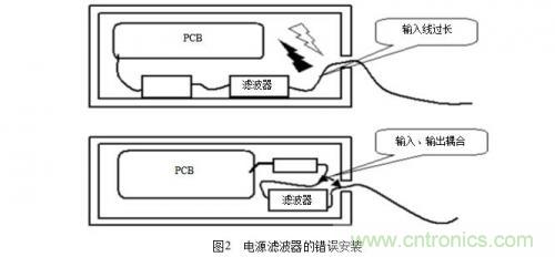 (3)在電源電路(尤其是開關(guān)電源中),操縱電路,控制電路,以及轉(zhuǎn)換電路中消除產(chǎn)生的干擾。在工程實際中,一個最值得注意的地方是電源濾波器的安裝,常見的濾波器的錯誤安裝如圖2所示。