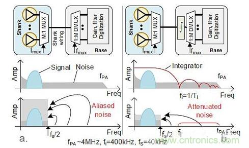 神經(jīng)探針的信號(hào)帶寬約為7.5kHz,可以采用15kHz對(duì)PA輸出采樣。設(shè)計(jì)人員發(fā)現(xiàn)可以將時(shí)分復(fù)用技術(shù)嵌入柄中(圖4a)。這樣做可以使每個(gè)獨(dú)特的柄線上有M個(gè)PA輸出。如果沒有加抗混疊濾波器進(jìn)行限制,則PA帶寬會(huì)由于折疊而產(chǎn)生帶內(nèi)噪聲。在采樣發(fā)生之前,將低通濾波器裝入這個(gè)小PA區(qū)域是不可能的。設(shè)計(jì)人員選擇使用能夠在Ti時(shí)間段對(duì)信號(hào)進(jìn)行積分的架構(gòu)(圖4b)來(lái)衰減超出采樣頻率fi的信號(hào),從而提高信噪比(SNR)。