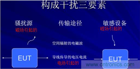 那么,構(gòu)成干擾要有三要素,騷擾源,傳播途徑,敏感設(shè)備。騷擾源分兩種,一種是電場(chǎng)的騷擾源,一種是磁場(chǎng)的騷擾源。