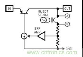 環(huán)路的不穩(wěn)定來(lái)自于相位移量,我們可以在反饋回路中通過(guò)變壓器注入正弦小信號(hào),如下圖所示,Loop Gain=Va/Vb,從Vb傳入交流小信號(hào),同過(guò)回路產(chǎn)生相移到達(dá)Va。這樣可以計(jì)算回路增益,相位的偏移量。(此處以LDO分析)