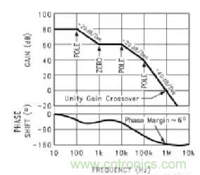假設(shè)直流增益為80dB(10-100Hz處的增益),100到1KHz增益減少了20dB,10K-100KHz增益減少20dB,100K-1MHz增益減少40dB(斜率有-20dB/10倍頻的變化)。圖中可以看出有3個(gè)POLE,一個(gè)ZERO。1MHz處的增益是0dB,說(shuō)明1MHz的小信號(hào)在此截止,此回路的帶寬就是1MHz。