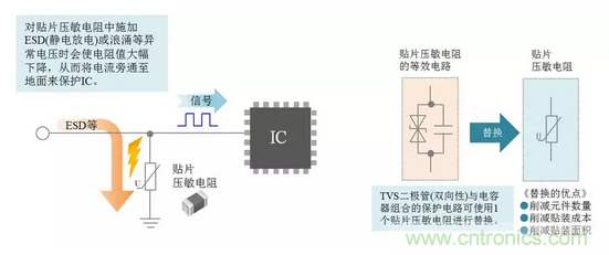 同時,在移動設(shè)備中,開關(guān)及麥克風(fēng)的小孔會成為人體產(chǎn)生的ESD的入口,因此需要采取ESD對策。貼片壓敏電阻可保護(hù)電路免受ESD(靜電放電)及浪涌等的影響,同時在通常情況下發(fā)揮著電容器的功能,因此還擁有抑制噪音的效果(圖3)。