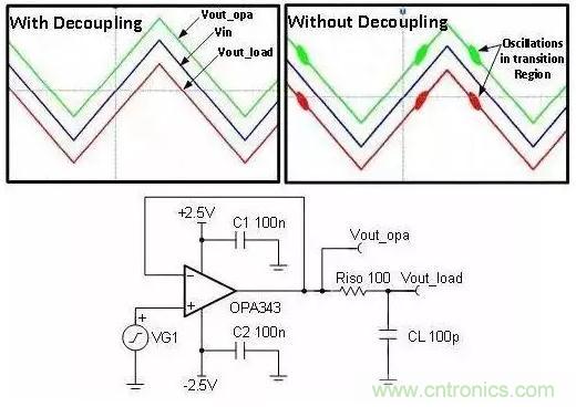 要回答這個(gè)問題,需要考證在不使用去耦器件時(shí)會(huì)出現(xiàn)什么問題。 圖 1 為帶去耦電容器和不帶去耦電容器(C1 和C2)情況下用于驅(qū)動(dòng) R-C 負(fù)載的緩沖電路。我們注意到,在不使用去耦電容器的情況下,電路的輸出信號(hào)包含高頻 (3.8MHz) 振蕩。對(duì)于沒有去耦電容器的放大器而言,通常會(huì)出現(xiàn)穩(wěn)定性低、瞬態(tài)響應(yīng)差、啟動(dòng)出現(xiàn)故障以及其它多種異常問題。