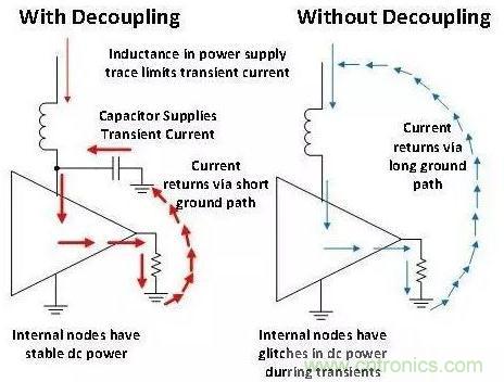圖 2 闡述了為什么去耦非常重要。需要注意的是,電源線跡的電感將限制暫態(tài)電流。 去耦電容與器件非常接近,因此電流路徑的電感很小。在暫態(tài)過程中,該電容器可在非常短的時(shí)間內(nèi)向器件提供超大量的電流。 未采用去耦電容的器件無法提供暫態(tài)電流,因此放大器的內(nèi)部節(jié)點(diǎn)會(huì)下垂(通常稱為干擾)。無去耦電容的器件其內(nèi)部電源干擾會(huì)導(dǎo)致器件工作不連續(xù),原因是內(nèi)部節(jié)點(diǎn)未獲得正確的偏置。