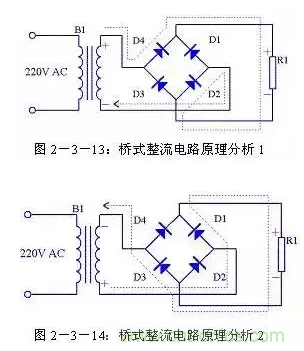 由圖2-3-13可以看出在電源正半周時(shí),B1次級(jí)上端為正,下端為負(fù),整流二極管D4和D2導(dǎo)通,電流由變壓器B1次級(jí)上端經(jīng)過D4、R1、D2回到變壓器B1次級(jí)下端;由圖2-3-14可以看出在電源負(fù)半周時(shí),B1次級(jí)下端為正,上端為負(fù),整流二極管D1和D3導(dǎo)通,電流由變壓器B1次級(jí)下端經(jīng)過 D1、R1、D3回到變壓器B1次級(jí)上端。R1兩端的電壓始終是上正下負(fù),其波形與全波整流時(shí)一致。