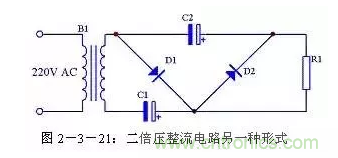 二倍壓整流電路還有另外一種形式的畫法,見圖2-3-21,其原理與圖2-3-18完全一致,只是表現(xiàn)形式不一樣。